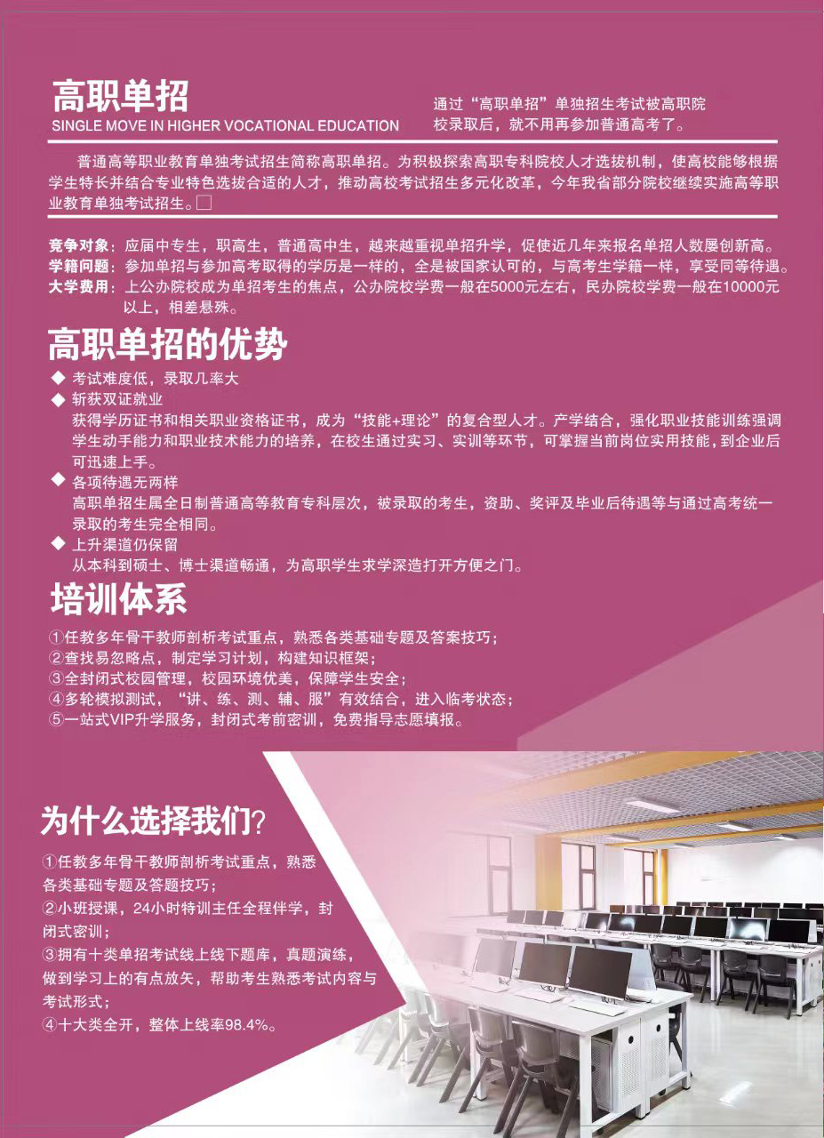 單招高考10大類全開,簽訂升學協議,確保升學無憂。