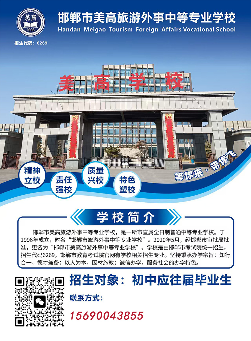 邯鄲市美高旅游外事中等專業(yè)學校,是一所市直屬全日制普通中等專業(yè)學校。于1996年成立,時名“邯鄲市旅游外事中等專業(yè)學!。2020年5月,經(jīng)邯鄲市審批局批準,更名為“邯鄲市美高旅游外事中等專業(yè)學!。學校是由邯鄲市考試院統(tǒng)一招生,招生代碼6269,邯鄲市教育考試院官網(wǎng)有學校相關(guān)招生專業(yè)。堅持秉承辦學宗旨:知行合一,德才兼?zhèn)?以人為本,因材施教;誠信辦學,服務(wù)社會的辦學特色。