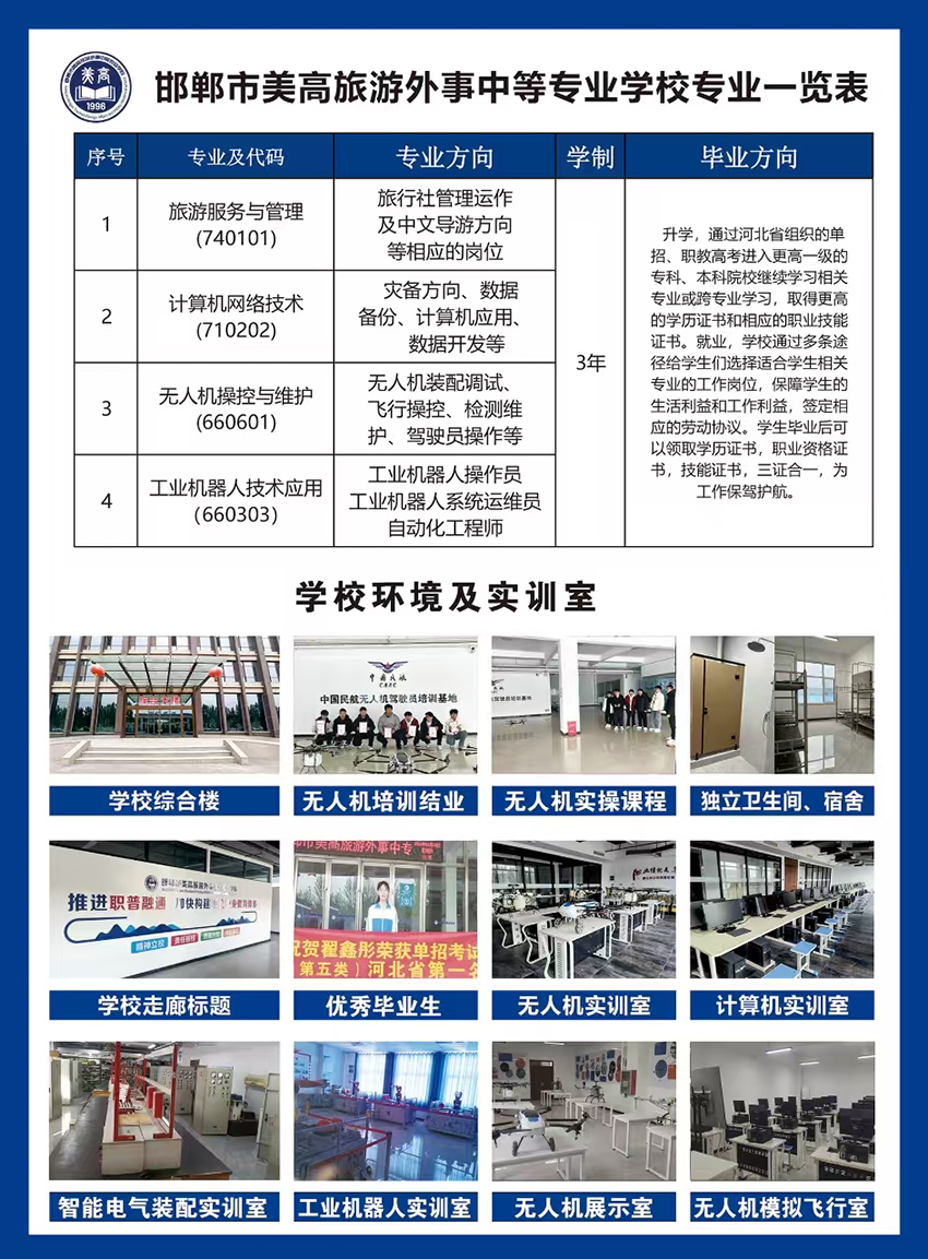 邯鄲美高旅游外事中專學校招生專業(yè):旅游服務(wù)與管理專業(yè)、計算機網(wǎng)絡(luò)技術(shù)專業(yè)、無人機操控與維護專業(yè)、工業(yè)機器人技術(shù)應(yīng)用專業(yè)。