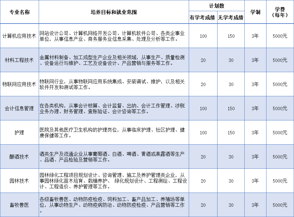 邯鄲科技職業學院緊緊圍繞我省十大戰略性新興產業、十二大重點產業以及邯鄲市“532”產業轉型升級的需要,總體規劃建設都市農業、裝備制造、能源和新材料、健康服務與管理、財經管理等專業群。2020年首批招生專業包括園林技術、畜牧獸醫、釀酒技術、材料工程技術、物聯網應用技術、計算機應用技術、護理、會計信息管理等,年度單招計劃共1000人。