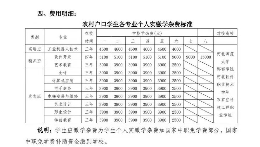 2.大專直通車精英班:學制三年,每年年學費7800 元(已刨除國補)每年住宿費800元(收前兩年) 石家莊財經學院特招班在五洲學制兩年每年學費8800元(已刨除國補)每年住宿費800元,第三年到石家莊財經學院學習,學費執行大專收費標準。
